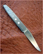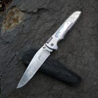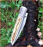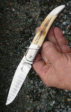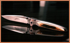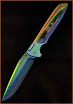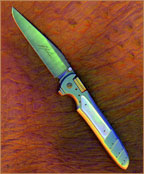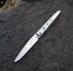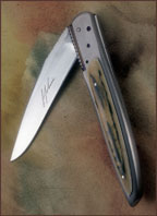 Folding knife Laguiole type mecanism , blade is ATS-34 with titanium inserts. Liners are titanium , anodised in decorative grooves. Handle is Siberian mammoth ivory . 4.5 inches closed |