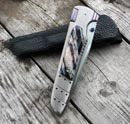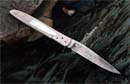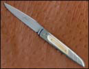 Folding knife Laguiole type mecanism , blade is ATS-34 steel. Liners are titanium , anodised in decorative grooves. Handle is mother of pearl. 4 inches closed |