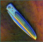 Titanium liners anodised in decorative grooves with an anodised titanium overlay. Laguiole type mecanism, Blade is ATS-34 4 inches closed |