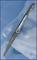 Slim Folding knife Laguiole type mecanism Blade is Devin Thomas stainless damascus steel. Liners are titanium , anodised in decorative grooves. Handle is mother of pearl. 4.5 inches closed |